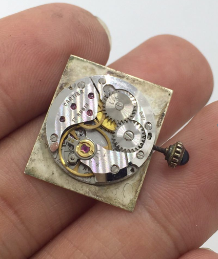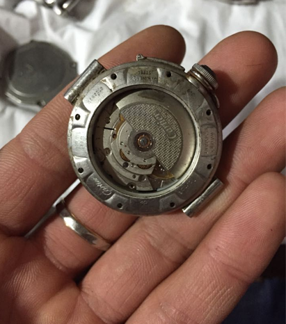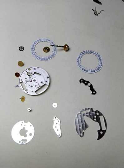 师傅打开手表后盖,取出机芯,将机芯零件逐一拆卸下,更换掉手表的把头;将所有零件放入全自动清洗机内清洗大约45分钟左右。