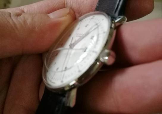 将破损的玻璃更换,将机芯安装在表壳内完成。(这里要提醒:若是表镜发生崩裂,破损严重,在送修前,需要拨出表冠停止运动,反戴手表,避免玻璃碎片划伤表盘,造成不必要的损伤。)