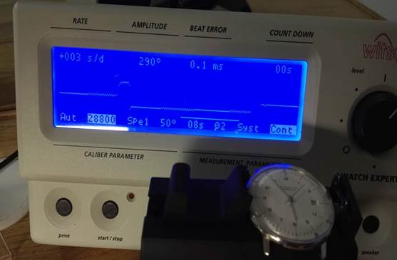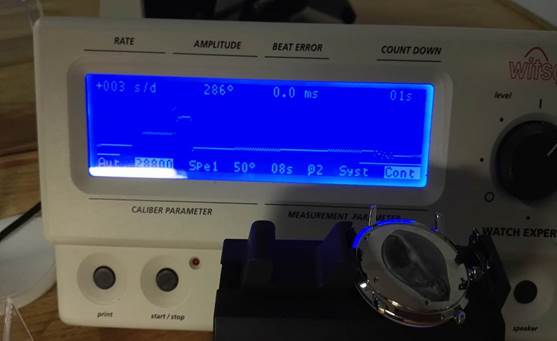 将手表放上测表机,通过5个方位,对手表走时的精准度进行调整。完成后,利用真空防水测试仪检测手表的防水性。
