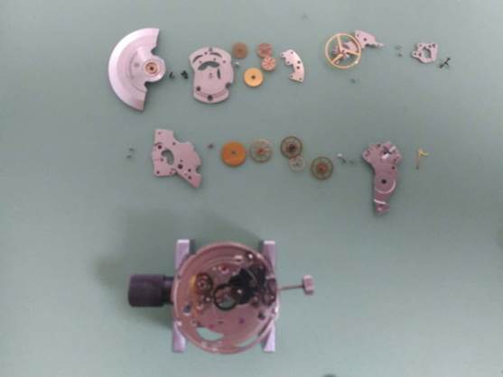 拆卸机芯零件,日历、自动部分、上链部分、拨针部分、擒纵等一一拆卸下,分类放在特制的清洗篮中(这是避免机芯机芯零件在洗油的过程中互相碰撞)。