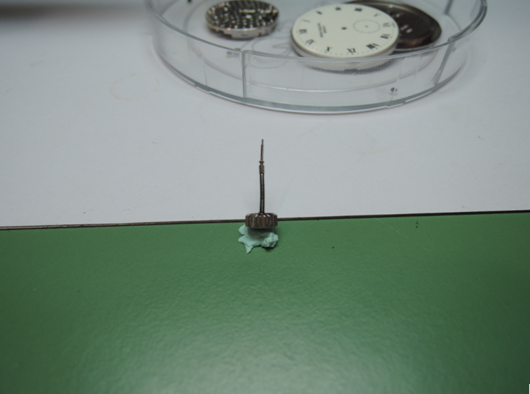 经过师傅检测发现:手表的拉杆已坏,成S型;表盘上有了裂痕。需要更换手表的把头。面盘暂时是可以使用的或是重新翻新、更换。(与表主确认更换表把,面盘不更换)