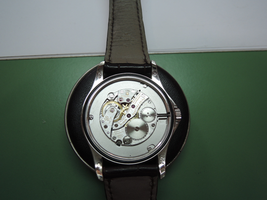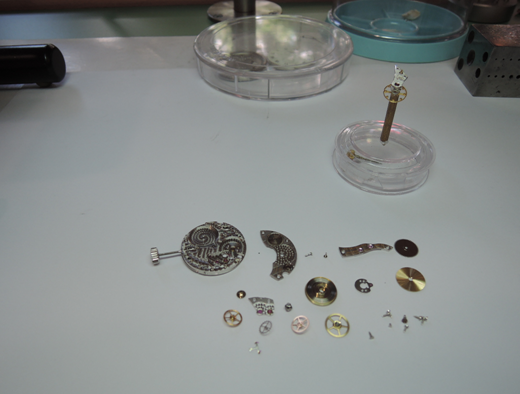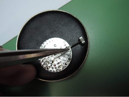 师傅打开手表后盖开始维修,逐一拆卸下手表的机芯零部件,更换掉变形的表把。将所有零件放入全自动洗油机内清洗45分钟左右取出,重新组装好手表机芯并在适当的位置点上一定量的润滑油。