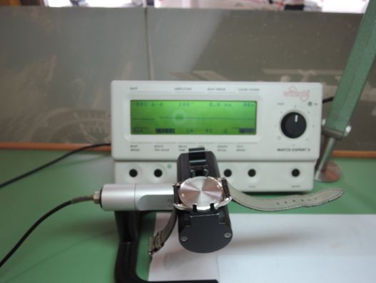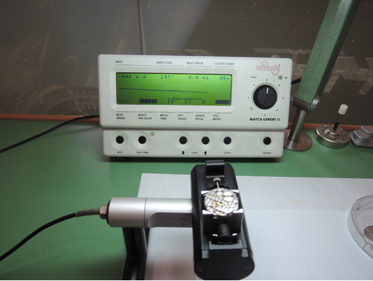 组装好的手表机芯一放上测表机,走时误差、摆幅大小的问题全来了。需要一一进行调整,直至标准范围之内。
