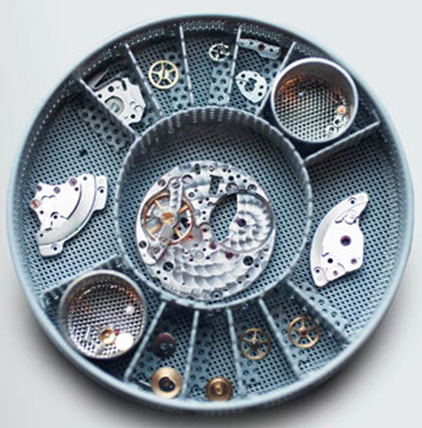 拆解机芯后,各组件以特别配方的溶液进行超声波清洁。
