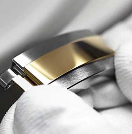 在初步清洁后,表壳和表链均经详细检查,然后,您的表壳和表链会以专业方式整修,并使用超声波清洗,让腕表散发光泽。