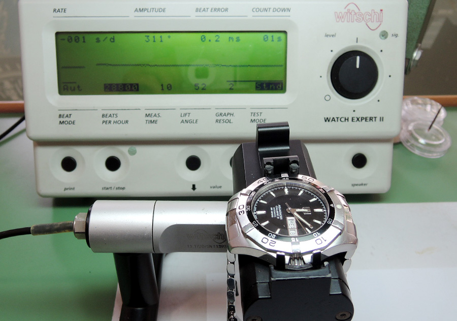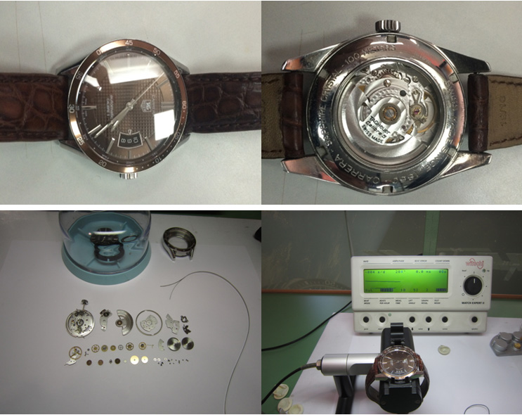 顾客的手表(豪雅卡莱拉WV211N.BA0787),市场价格大概在2万左右。配上棕色的真皮表带,更显品位。根据表主反映:该表2011年购买,其间出现过雾气。出现雾气后走时偏快日差15秒,以前误差+2秒。希望师傅给予全面保养、防水测试及多方位调整走时;快慢针在中间的位置进行走时校准。经过检测发现:手表之前出现过雾气,但没有残留下过多的水分,机芯没有什么问题;但表主长时间未保养,机芯内油泥干涸;主要需要洗油保养。